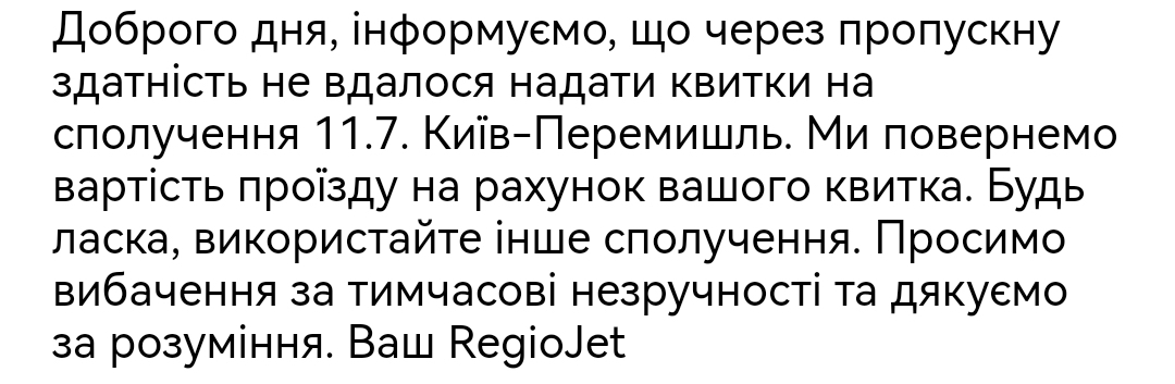 Чимало пасажирів, які купували такий єдиний квиток, виявляють, що їхню поїздку в українському поїзді скасовано. RegioJet пропонує повернути вартість квитка на цю частину маршруту, місце в чеському поїзді зберігається. Історії українок, які отримали від чеської компанії «листи щастя» можна почитати, зокрема, тут, тут і тут. В одному випадку пасажирка поїзду Київ-Перемишль виявила, що її квиток дійсний, але те саме місце було продано ще одній пасажирці.
