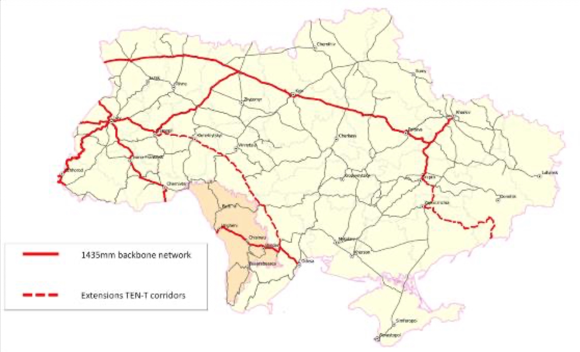 3. продовження колії від Києва до Харкова та Дніпра; відрізок від Рави-Руської до Львова; відрізок від Львова через Івано-Франківськ і Чернівці до Румунії; відрізок від Одеси до Кишинева.