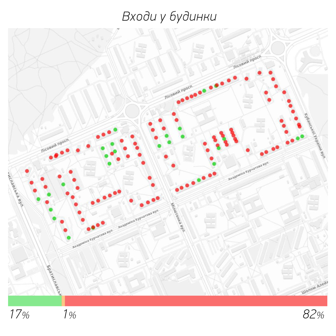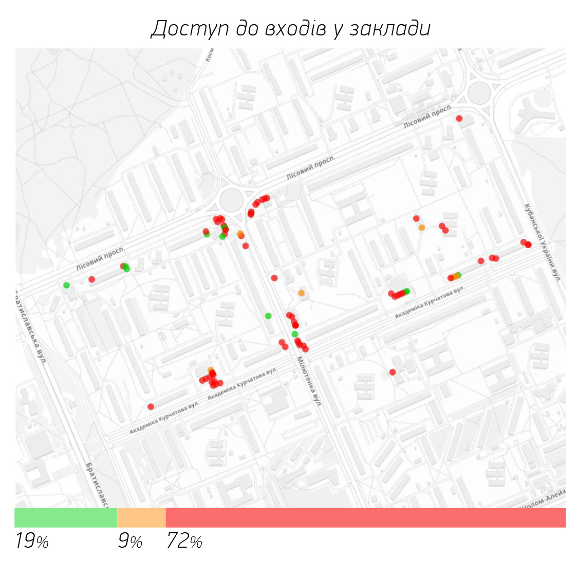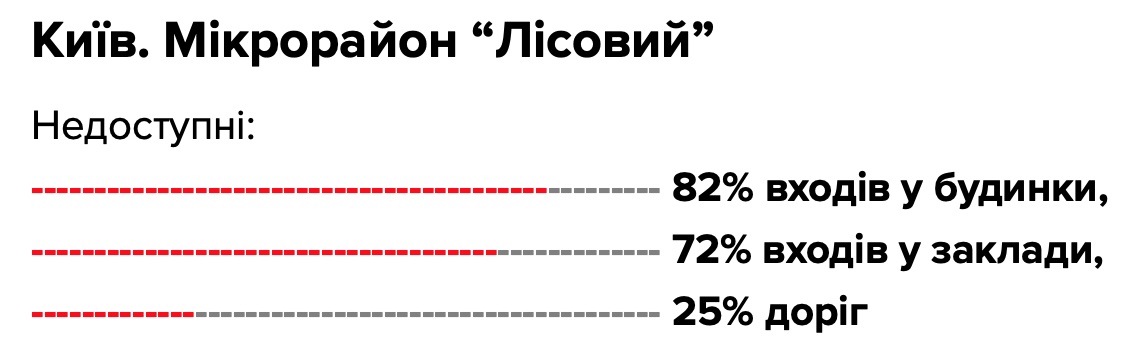 Так, у Києві обрали квартали між вулицями Кубанської України, Курчатова, Братиславською та Лісовим проспектом на Лісовому масиві. Ситуація з безбар’єрністю тут приблизно така ж, як у Запоріжжі та Луцьку. Найгірші показники виявилися у Східному мікрорайоні в Житомирі — там недоступні майже 40% доріг і 94% входів у будинки.