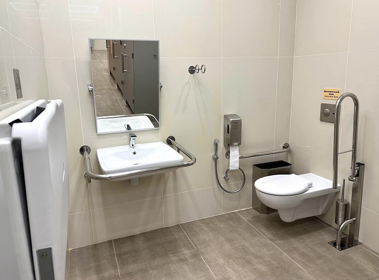 Вбиральня повністю безбар'єрна і пристосована для людей на кріслах колісних.