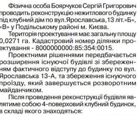 За документами, на цьому місці планують будувати чотириповерховий «клубний будинок» на замовлення Сергія Боярчукова з юридичної компанії «Алєксєєв, Боярчуков та партнери», повідомляє Володимир Хенгістов.