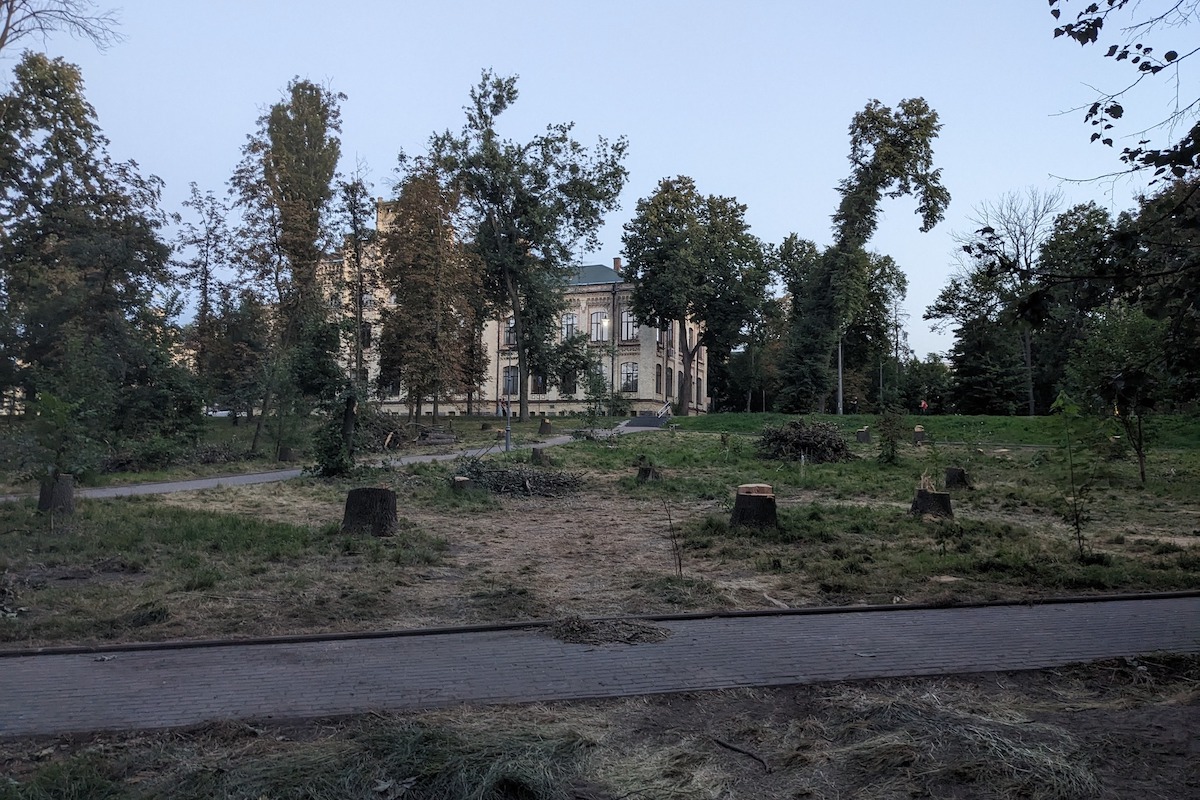 Ясени в частині парку КПІ вирубали за результатами обстеження, проведеного у липні 2021 року, повідомляє Київзеленбуд.
