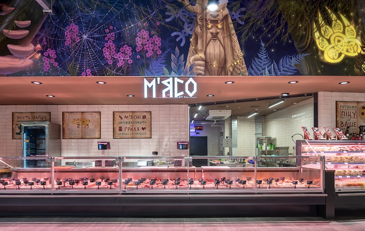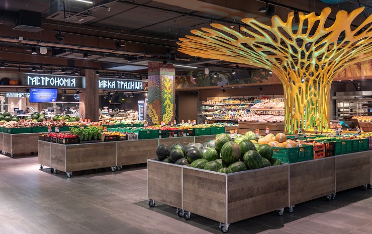 Саме статуя бога Велеса зустрічає гостей на вході до магазину. Посеред овочевого відділу розміщена інсталяція дерева життя, яке символізує єдність трьох світів – небесного, земного та потойбічного. Касові лайтбокси виконані у формі тотемів Велеса, у дизайні торговельного залу багато старовинних язичницьких символів та елементів побуту.