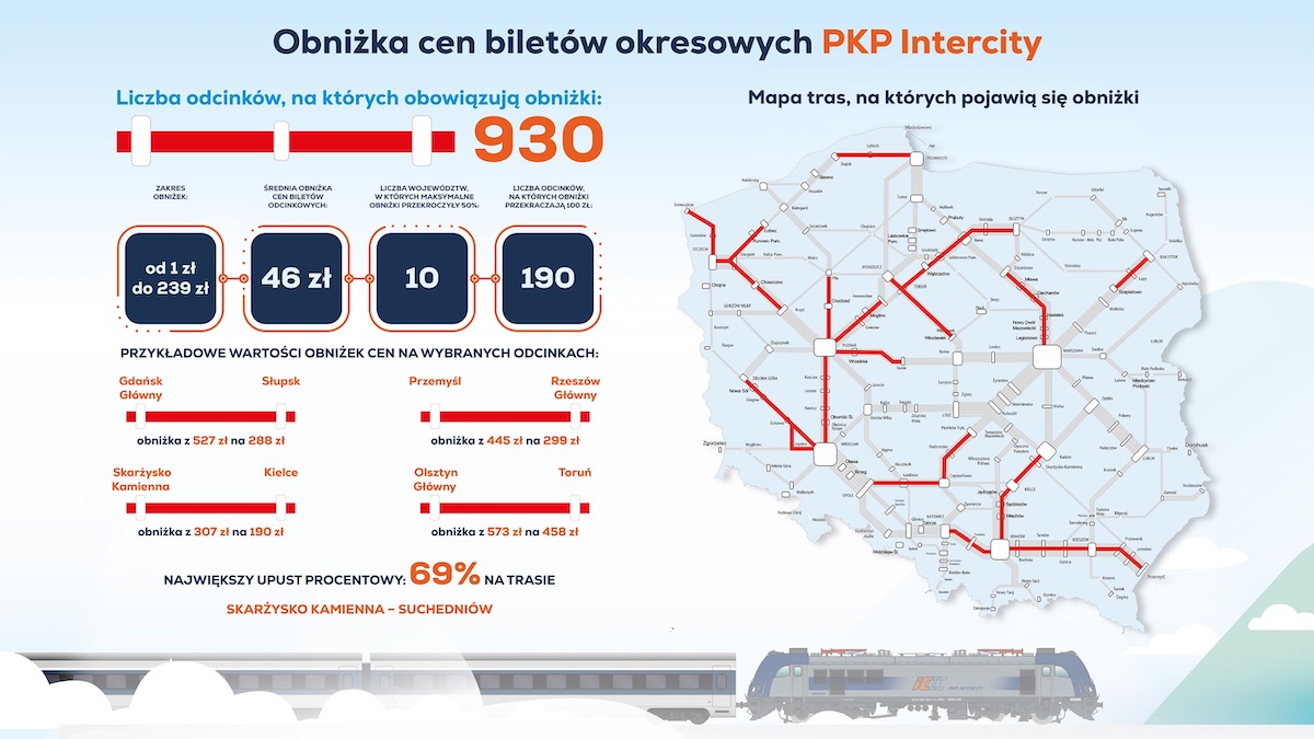 З нового навчального року місячні проїзні абонементи на поїзди PKP Intercity в Польщі продають зі знижкою до 60% на окремих ділянках. Знижки стосуються загалом 930 ділянок на більш як двадцяти обраних маршрутах.