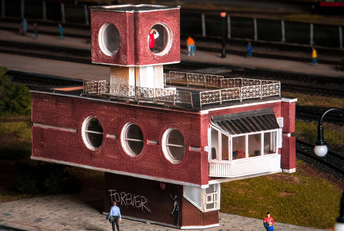 На найбільшому залізничному макеті в Україні – Miniland – з’явилася мініатюрна копія модерністської будівлі колишньої трамвайної диспетчерської на Львівській площі в Києві, зменшена у 87 разів.
