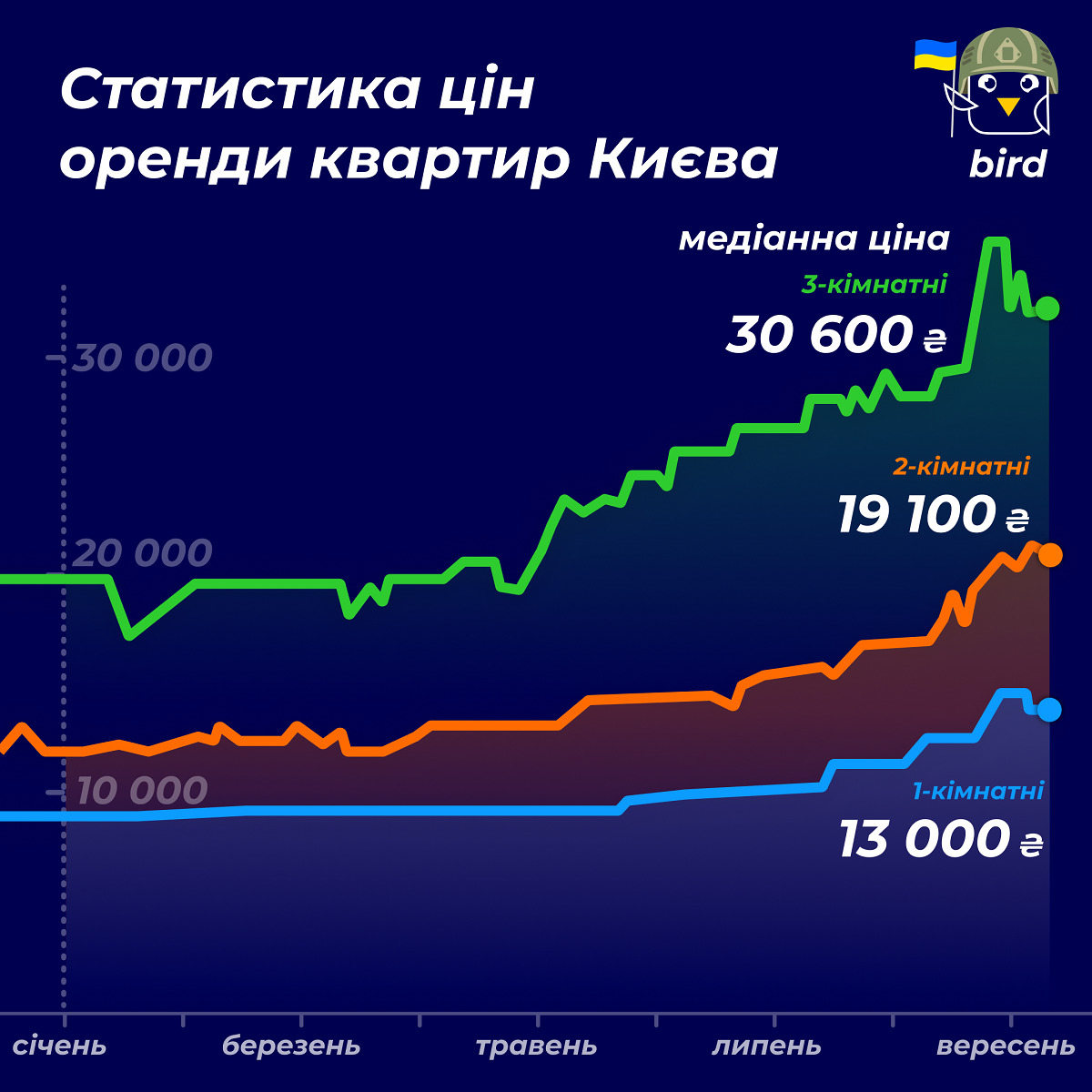 Медіана ціни на однокімнатну квартиру в Києві у вересні збільшилася на 18%, і становить 13 000 гривень, на двокімнатну на 19% (19 100 гривень) і на трикімнатну на 11% (30 600 гривень) в порівнянні з серпнем.