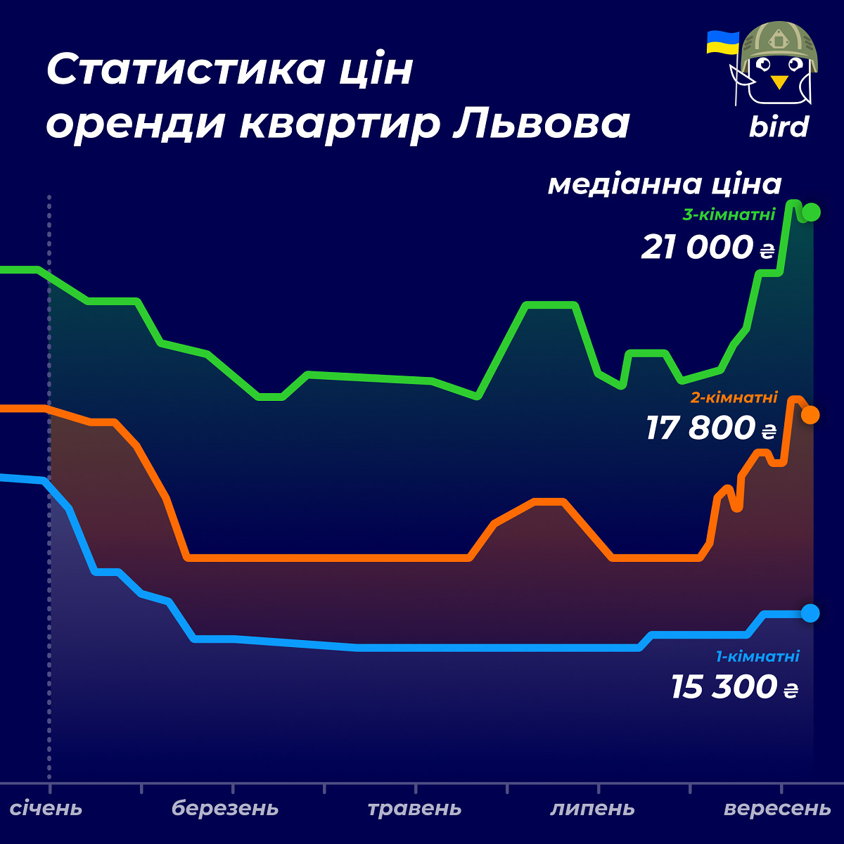 Вартість оренди квартир в Києві та Львові продовжує зростати. Медіана ціни двокімнатної квартири виросла за місяць на 18% та 11% відповідно, повідомляє команда iOS-застосунку для оренди квартир bird.