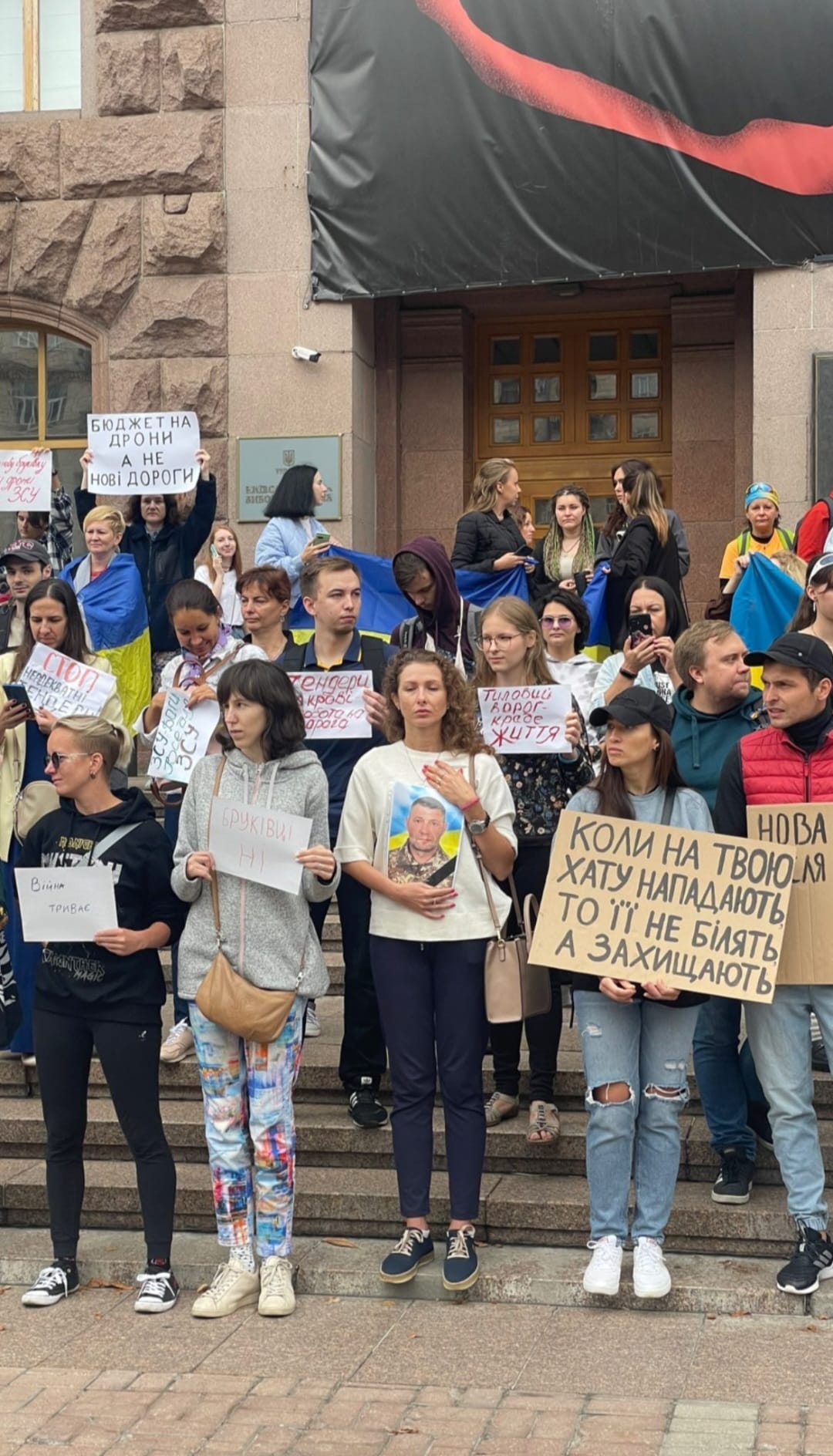 Під будівлею КМДА на Хрещатику проходять одиночні пікети через недостатнє фінансування армії з міського бюджету. Учасники закликають міську владу спрямовувати більше грошей на армію.