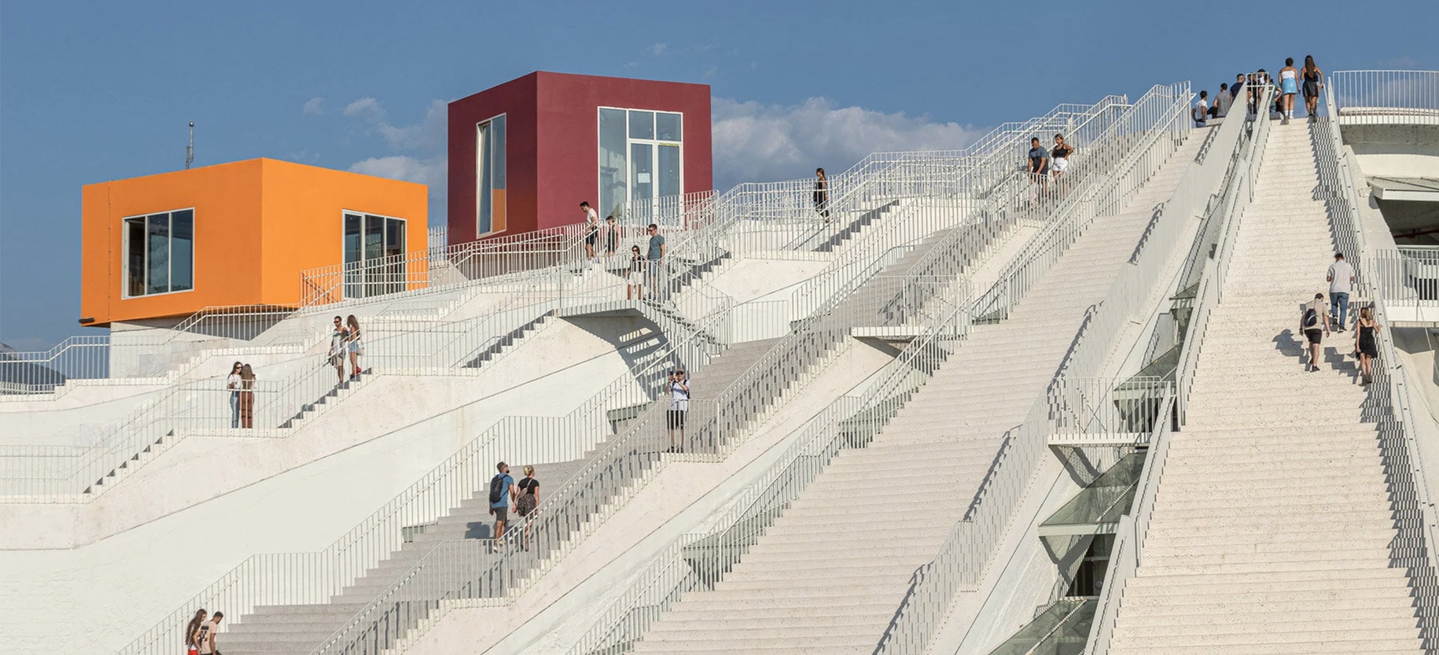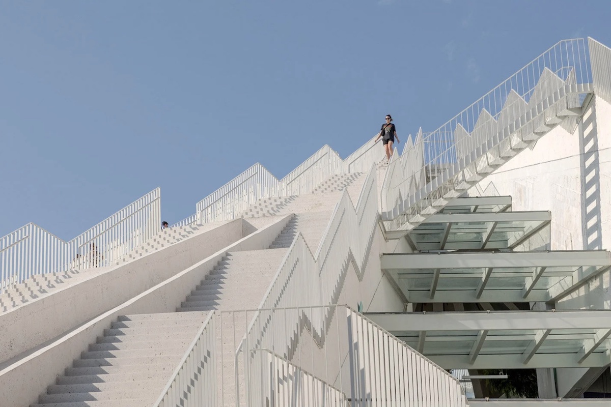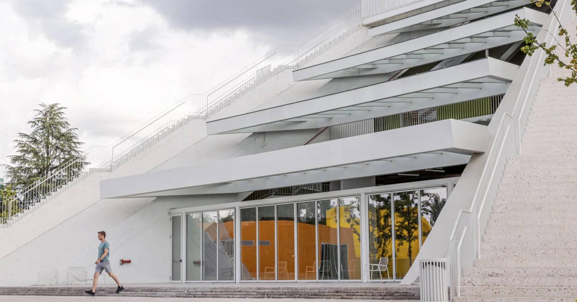 Перше, що кидається в очі, — на бетонних схилах з’явилися сходи. Раніше підлітки видиралися на дах, і архітектори вирішили переосмислити це стихійне використання будівлі.