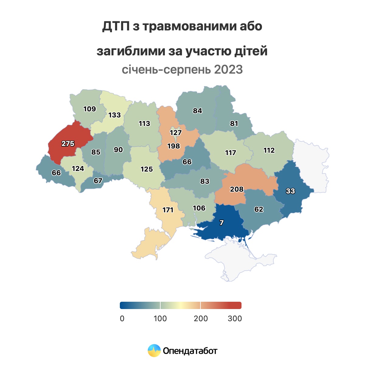 Цьогоріч на дорогах України сталося на 7% більше аварій, в яких травмувалися або загинули діти, порівняно з аналогічним періодом 2021-го року, повідомляє Опендатабот. Зокрема, за вісім місяців, із січня по серпень, загинуло 116 дітей.