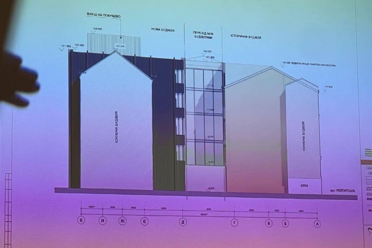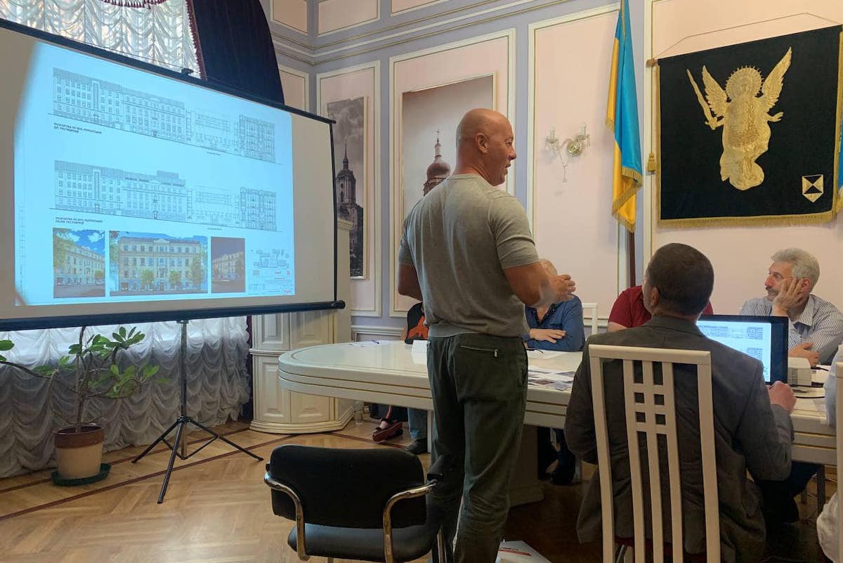 На засіданні керівник компанії-забудовника НЕСТ Еміль Соловйов презентував проєкт будівництва бізнесцентру Reitar Hall на місці історичної будівлі.