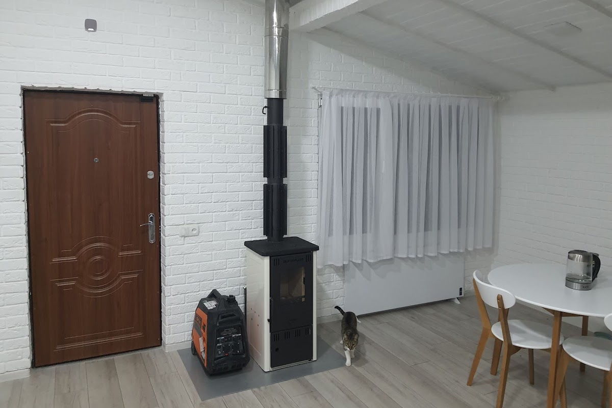На випадок повного блекауту мають піч-комин на дровах. До неї додали радіатори, щоб максимально ефективно розсіювалося тепло. На ній є конфорка для приготування їжі.