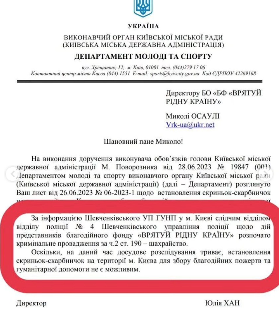 Проти цієї організації відкрито кримінальну справу за статтею «шахрайство». Доки триває слідство, її представники не мають права збирати пожертви. Відповідні документи публікували на сторінці Дарниця Live.