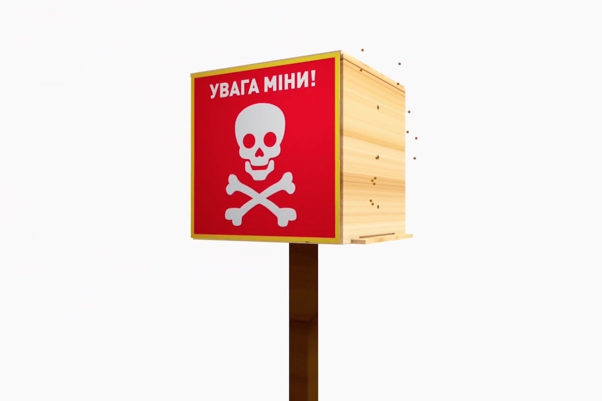 Для проєкту розробили спеціальний дизайн вуликів у форматі попереджувальних знаків про мінну небезпеку.