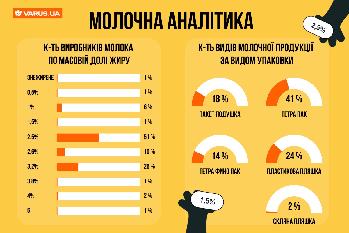 На varus.ua твій вибір молочної продукції — це не просто вибір смаку, а важливе рішення. Серед 51% молока, яке представлено в асортименті, найпопулярнішим є з 2,5% жирності. Також кожен клієнт може замовити знежирене та молоко різного відсотка жирності.