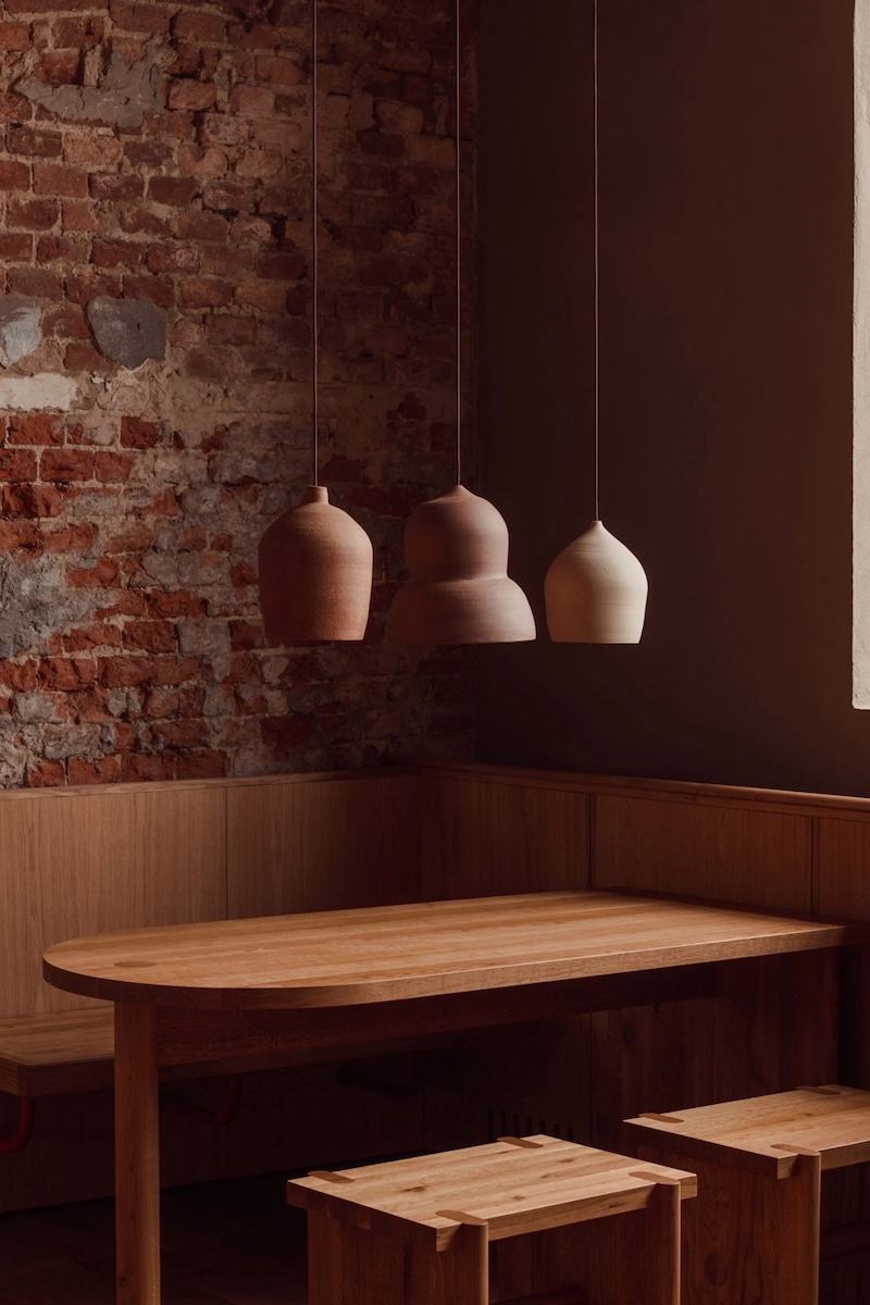 Серед інших елементів інтер’єру — дубова підлога, прості дерев’яні меблі та глиняні лампи ручної роботи.