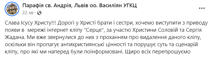 «Слава Ісусу Христу! Дорогі у Христі брати і сестри, хочемо виступити з приводу появи в мережі інтернет кліпу «Серце», за участю Христини Соловій та Сергія Жадана. Ми вже звернулися до них з проханням про видалення цього кліпу, оскільки він пропагує антихристиянські цінності та порушує суть та сценарій кліпу, про які ми наперед були поінформовані. Щиро всіх перепрошуємо!», – йдеться у видаленому дописі парафії у Facebook.
