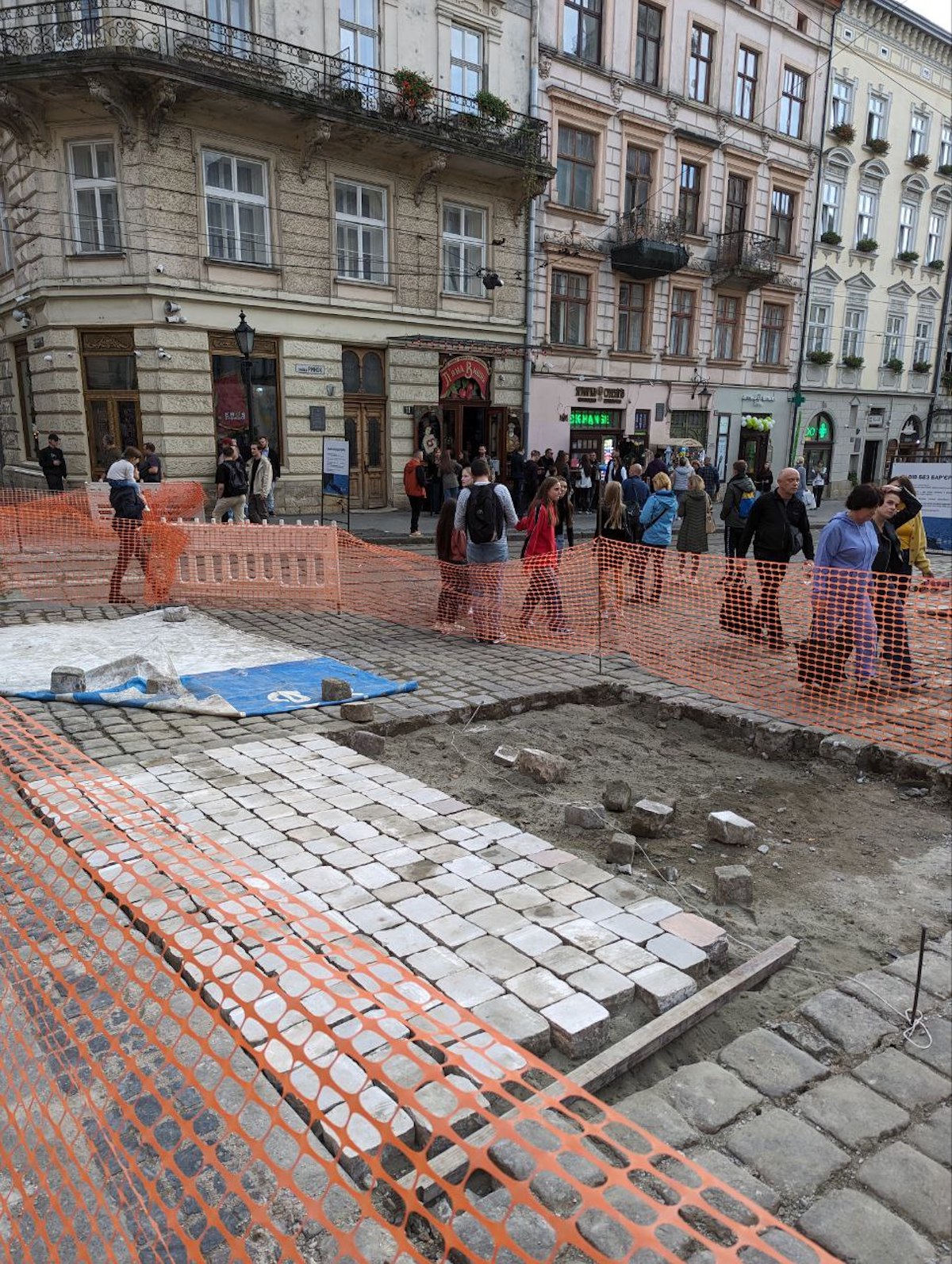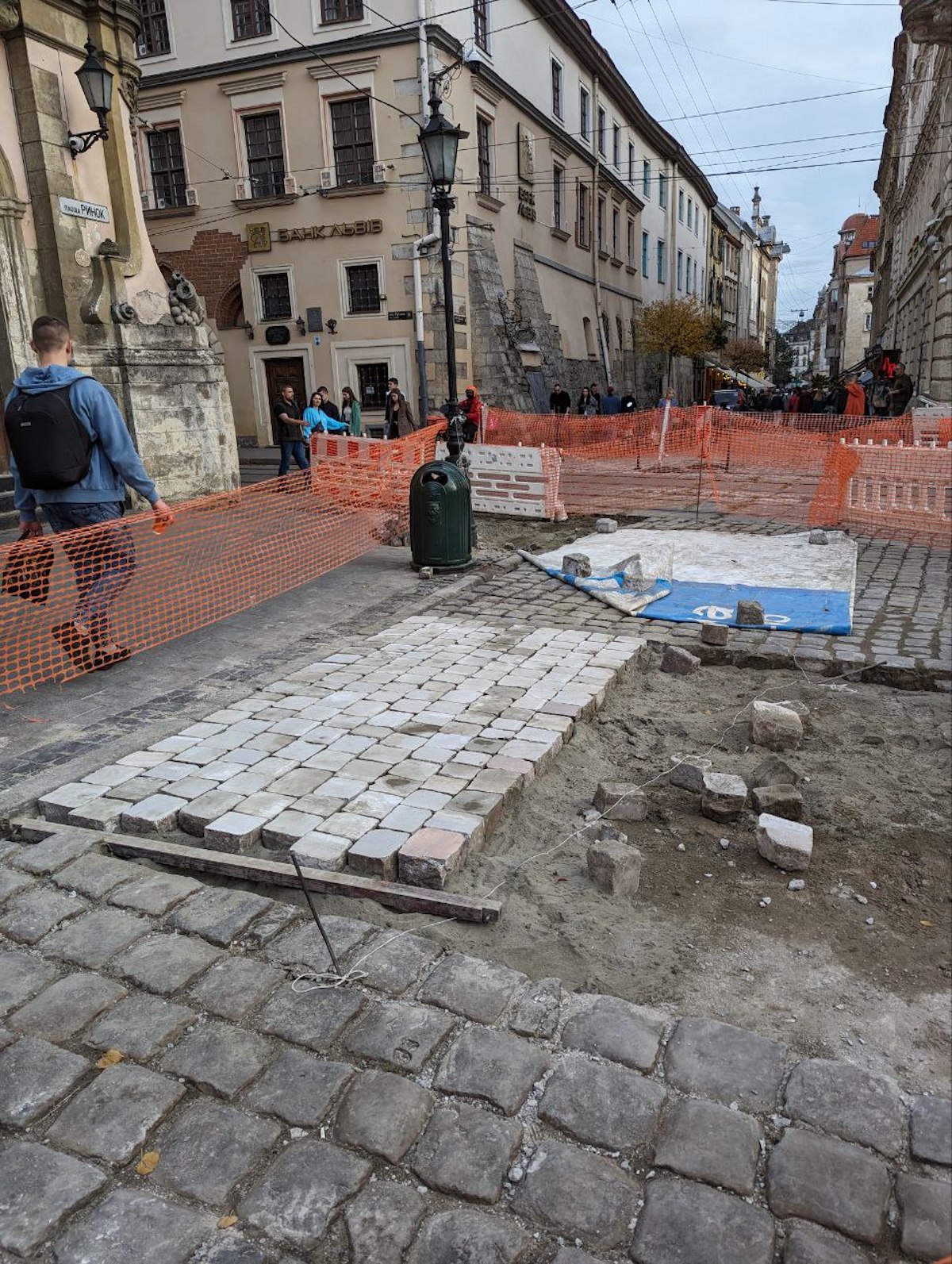 З окремих частин площі почали знімати стару нерівну бруківку, щоб створити «доріжки доступності» — каміння шліфують та укладають назад.