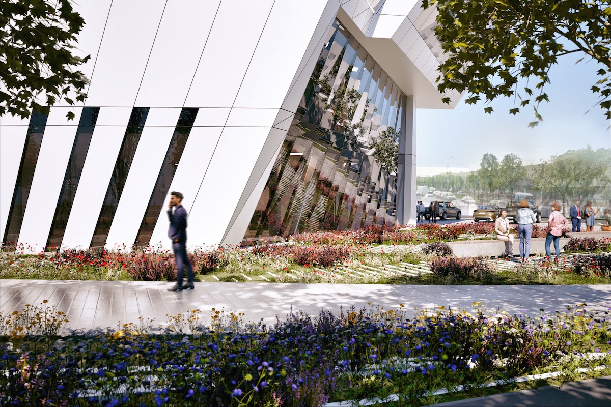 На першому поверсі відвідувачі потраплятимуть в атріум, де також розташовано кафе. Навколо будівлі передбачено благоустрій.