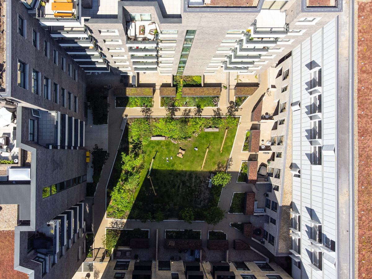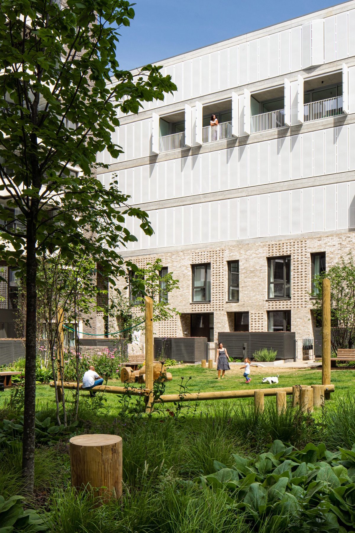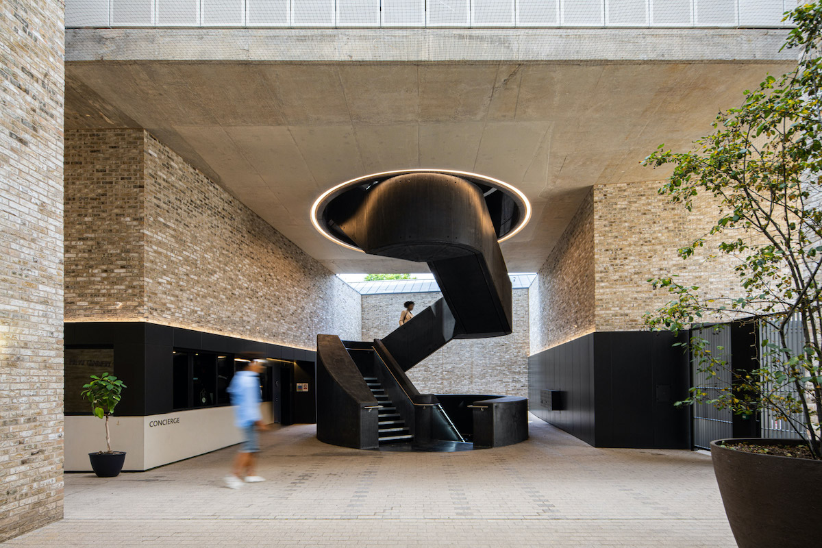 По обидва боки від цієї будівлі облаштували подвір’я. Перше — громадський простір з відкритим доступом; воно формальніше, з покриттям із плитки. Інше, внутрішнє, призначене для мешканців комплексу — воно «дикіше», його засіяли травою.
