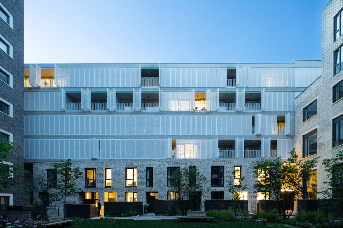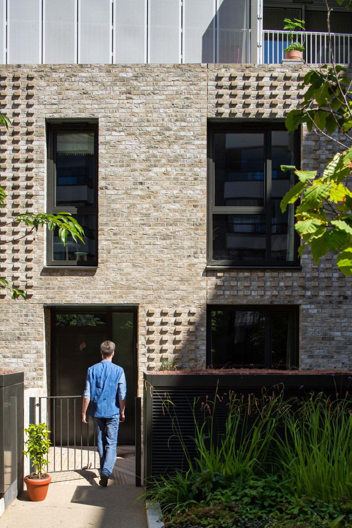 Ще одна, видовжена будівля вміщає квартири у форматі таунхаусів. Фасад прикрито перфорованими алюмінієвими віконницями, які ефектно виглядають вночі. Нижні два рівні будівлі — цегляні.