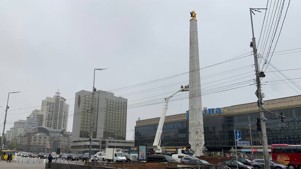 У суботу на Галицькій площі, колишній площі Перемоги, демонтували радянську зірку з обеліска на честь міста-героя Києва. Роботи тривали протягом усього дня.