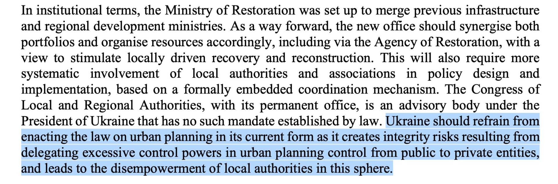 «Україні слід утриматися від ухвалення закону про містобудівну діяльність у його нинішньому вигляді, оскільки він створює репутаційні ризики внаслідок делегування надмірних контрольних повноважень у сфері містобудівного управління від державних до приватних структур, а також призводить до безправ’я місцевих органів влади у цій сфері», — йдеться на сторінці 14.