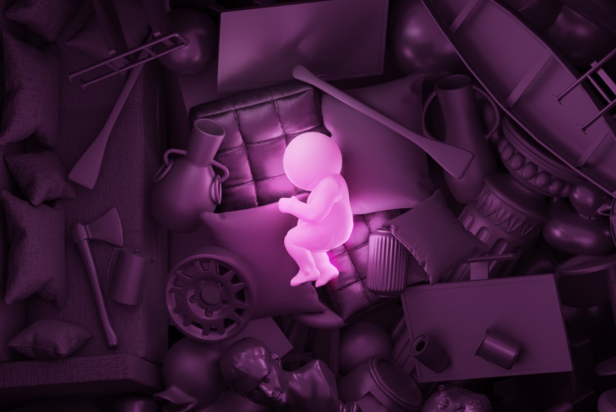 Олег Антонов створив 3D-ілюстрацію. «Ця робота про вразливість і силу. Цей чоловік не хоче, аби всі бачили, як він лежить скрученим у кімнаті й про щось мріє», — пояснює він.