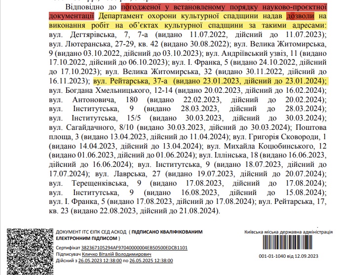 У січні цього року КМДА видала дозвіл на роботи за адресою Рейтарська 37.