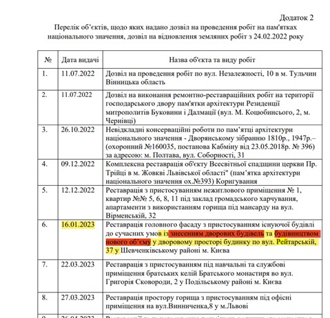 23 січня 2023 року Департамент культурної спадщини КМДА видав дозвіл на роботи, які передбачали часткове знесення пам’ятки, заявляє Шуляк і надає витяг з документу: