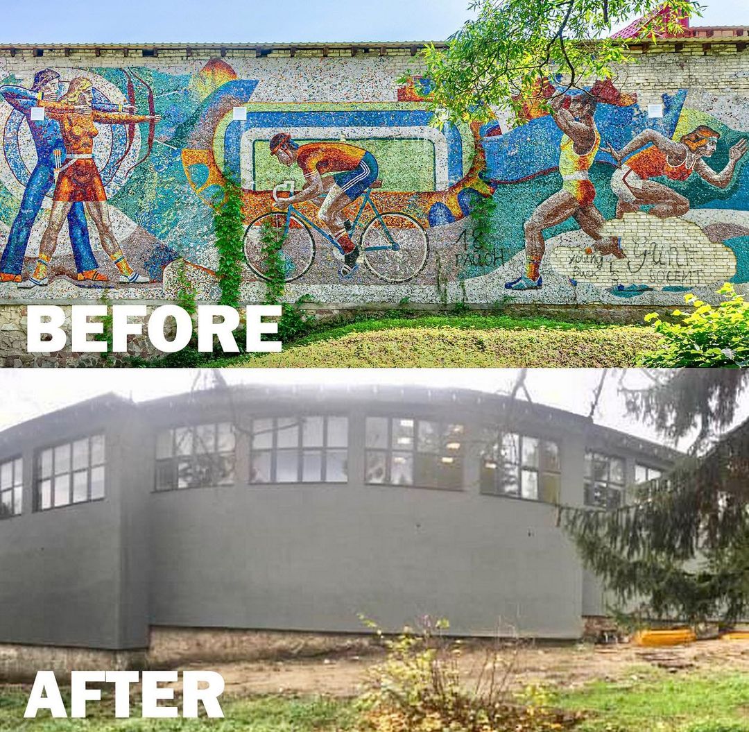 У Львові ймовірно знищили 20-метрову мозаїку зі спортивними сюжетами, повідомив активіст Дмитро Соловйов. Це сталось під час утеплення фасаду Львівського університету безпеки життєдіяльності.