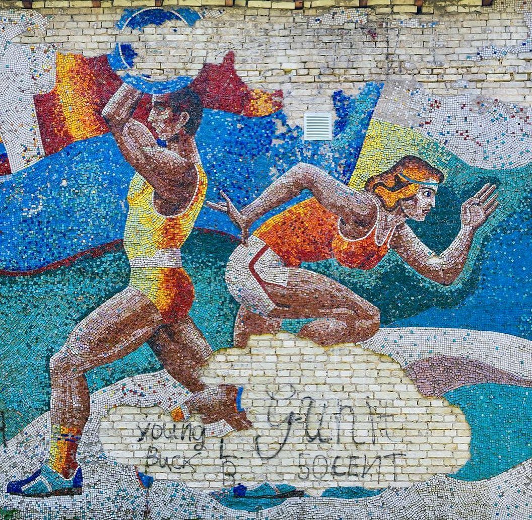 Твір складаися з восьми сюжетів, що зображали спорт. Художники виклали зі смальти велотрек, стрільбу з луку, важку атлетику, біг, футбол, гімнастику та багато інших сюжетів. Два фрагменти були зафарбовані сірою фарбою у 2017 році, зазначає Соловйов.