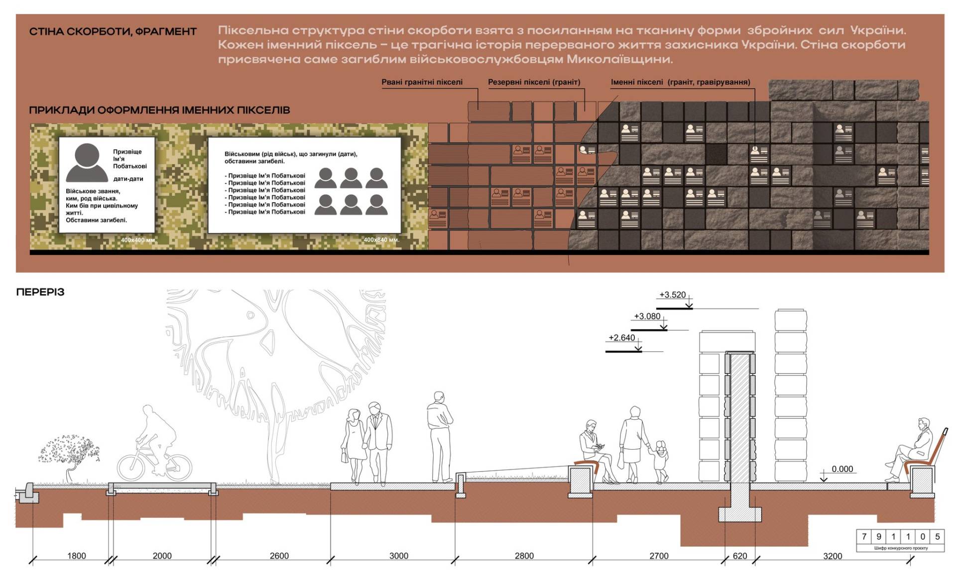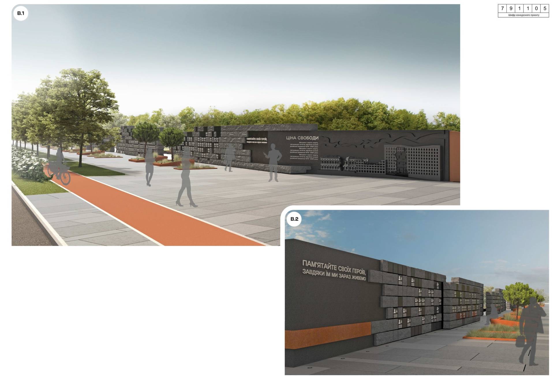 Ліворуч від композиції буде «стіна скорботи», виконана в піксельній структурі, що нагадує тканину військової форми ЗСУ. Праворуч знаходитиметься монумент з граніту з нанесеними іменами та прізвищами загиблих.