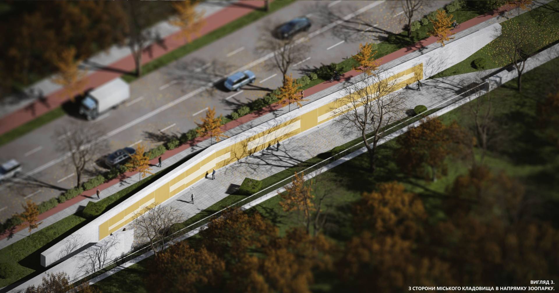 У стіні, яка веде від Центрального проспекту до меморіалу буде укриття та громадська вбиральня. За проєктом не передбачено жодних сходів – лише нормативні пандуси. Для підкреслення концепції згинів ландшафту пропонується покрити весь простір газоном.