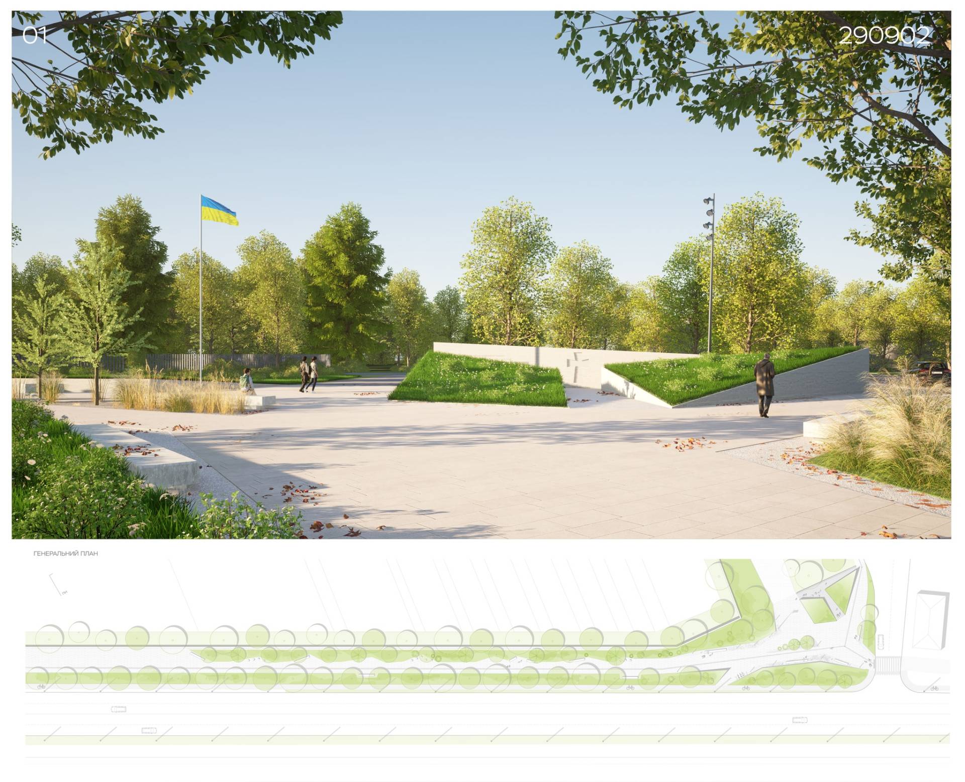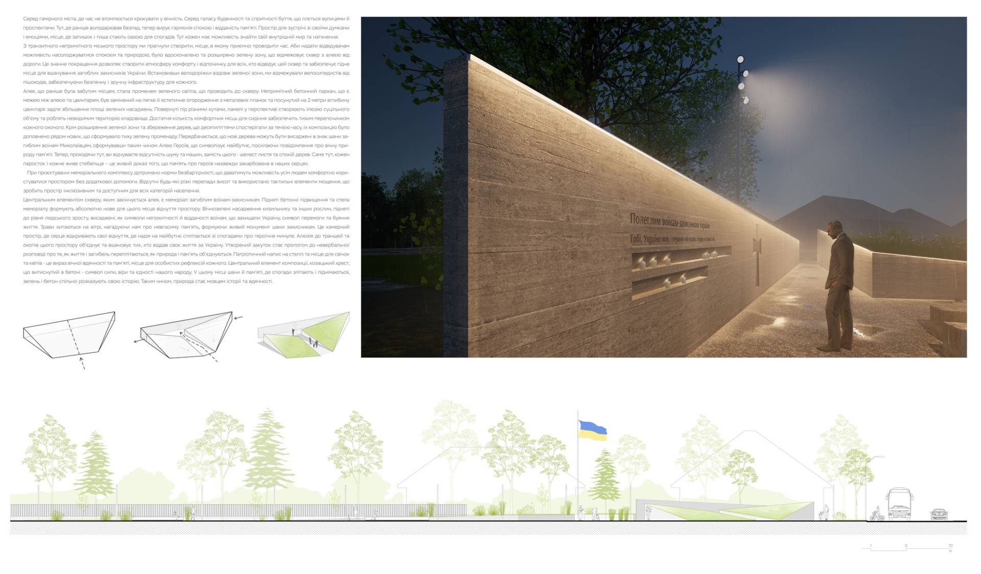 Центральним елементом скверу, до якого веде алея, є меморіал загиблим воїнам у вигляді бетонних підвищень та зелених насаджень, піднятих до рівня людського зросту – вони формують алюзію на траншеї та окопи. Також буде встановлена стела, головним елементом якої стане козацький хрест, витиснутий у бетоні.