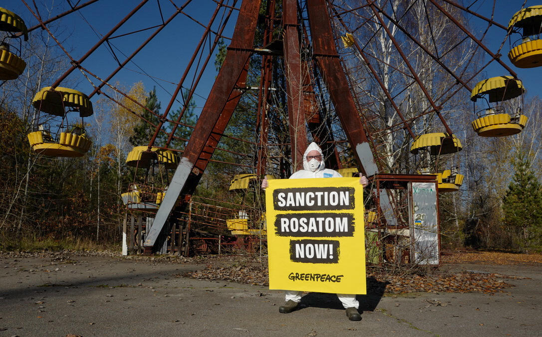Greenpeace та SaveDnipro закликали терміново запровадити санкції проти російської державної ядерної корпорації «Росатом» після ознайомлення з ситуацією у Чорнобилі, Запоріжжі та інших прифронтових містах на півдні України. Окупація Запорізької АЕС у березні 2022 року Росатомом та російськими збройними силами поставила під загрозу роботу та безпеку електростанції. Атаки Російської федерації на енергетичний сектор України збільшують ризики ядерних катастроф не лише на Запорізькій АЕС, але й на інших діючих ядерних реакторах. У березні 2022 року російські збройні сили спробували захопити АЕС в Южноукраїнську Миколаївської області, проте їх зупинили ЗСУ за 30 км від станції. Варто нагадати і про ракетні обстріли три тижні тому поблизу Хмельницької АЕС, які завдали шкоди адміністративним будівлям станції.