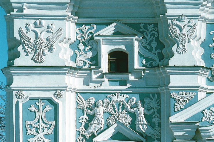 Подібні зображення двоголових орлів є серед ліпнини на дзвіниці Софії Київської, зведеної в 1706 році. В лапах птахи тримають символи вищої влади — скіпетр та державу. Такий же символ є на срібних царських вратах софійського іконостасу середини ХVІІІ століття.