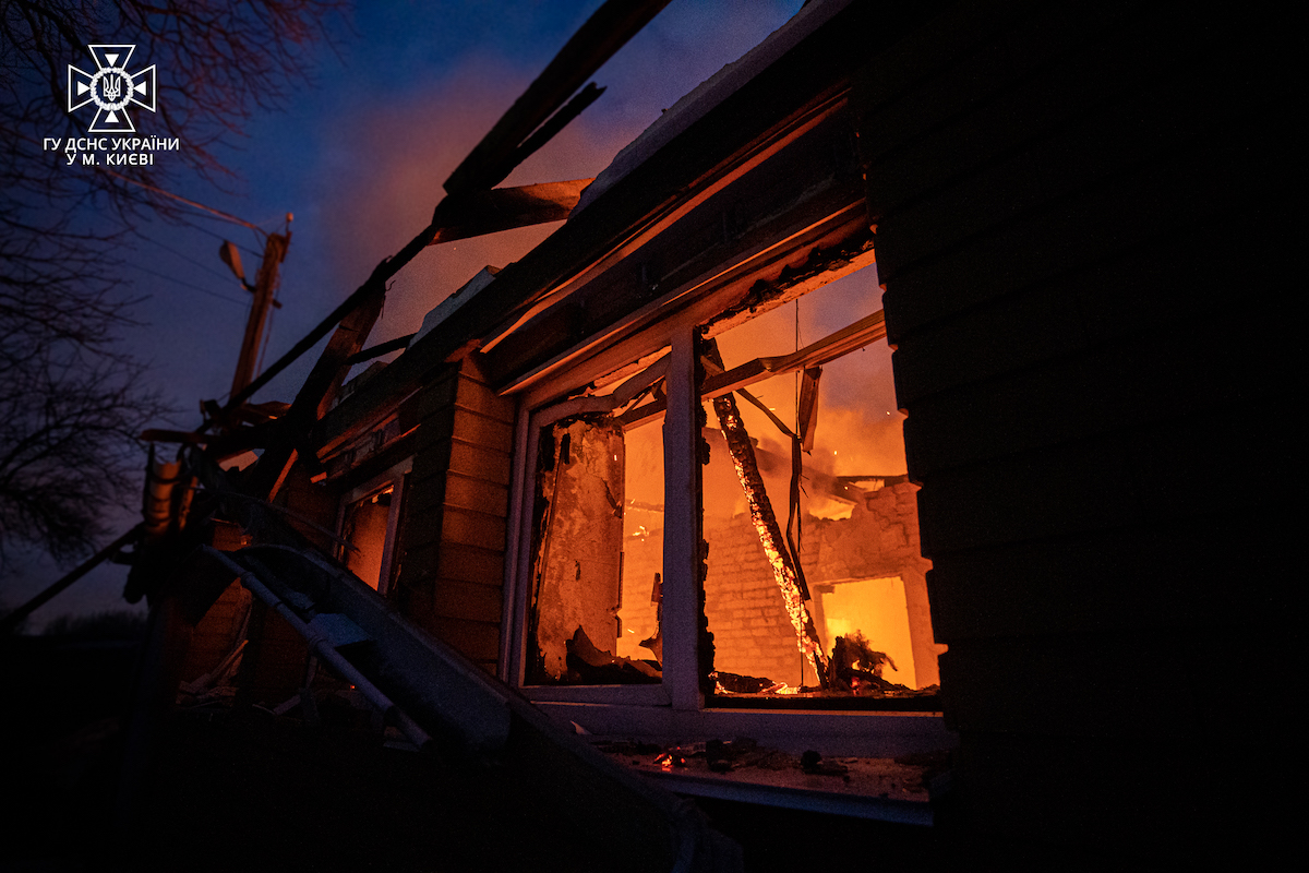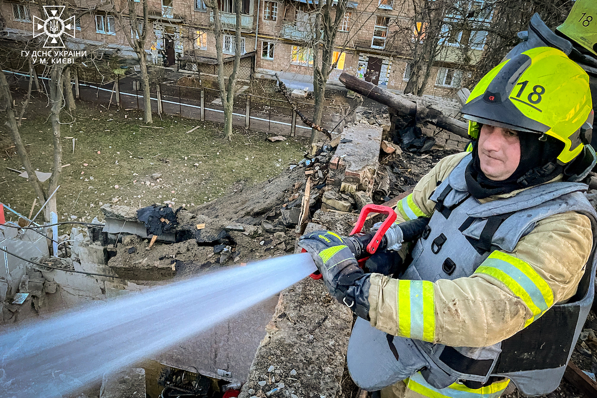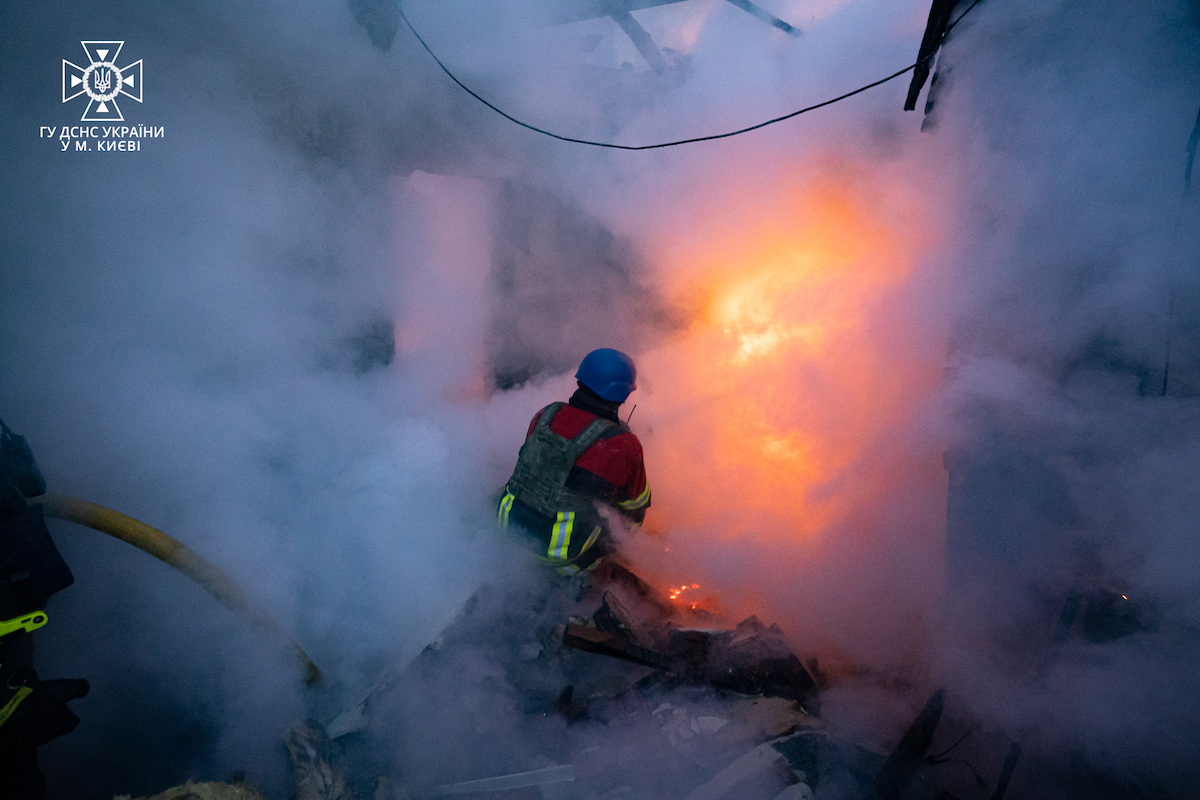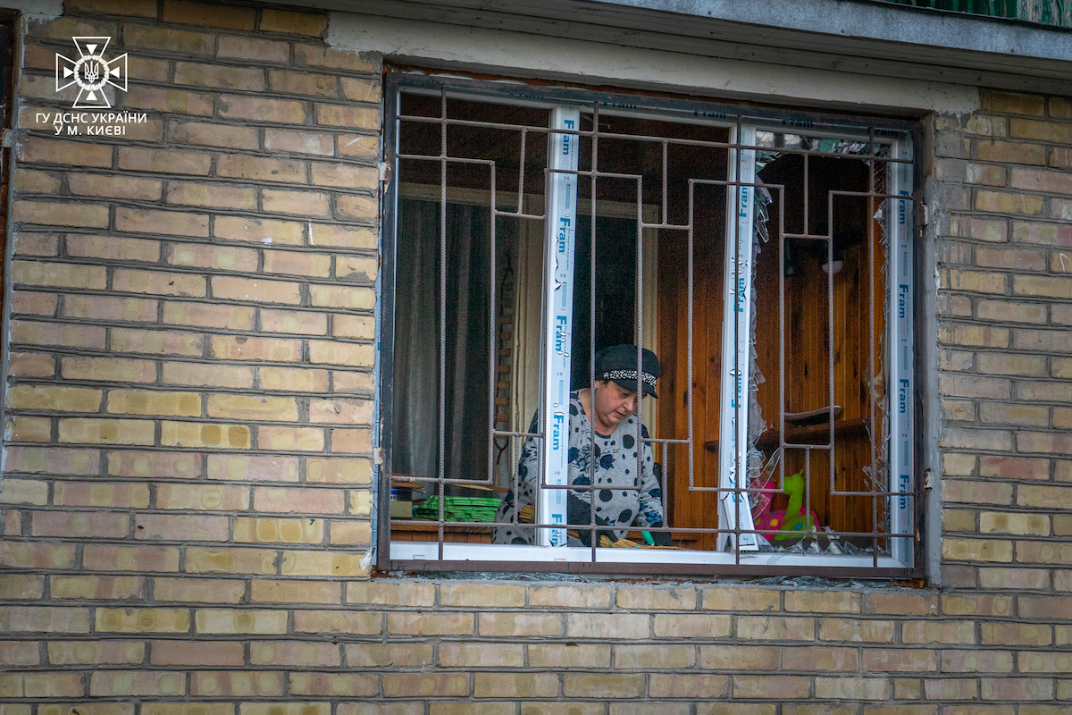 У Солом’янському районі внаслідок падіння уламків дрона виникла пожежа в дитсадку, в сусідніх будинках пошкоджені вікна. У тому ж районі на другому поверсі п’ятиповерхівки опинилися заблокованими дві жінки, їх звільнили. У будинку вибуховою хвилею вибито вікна, пошкоджено чотири автомобілі.