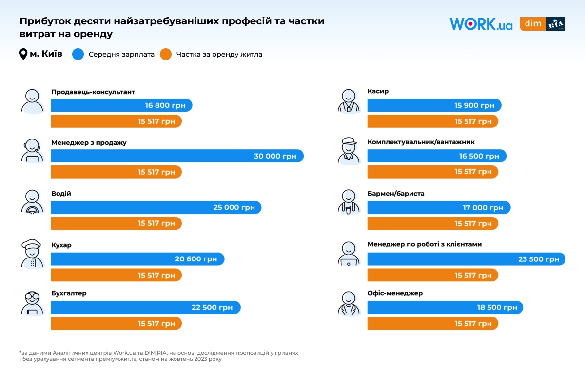Відібравши 10 найзатребуваніших професій, аналітики виявили, що в Києві житло найлегше винаймати менеджерам з продажу — ці фахівці заробляють в середньому 30 тисяч гривень, тож на оренду витрачають 52% доходу.