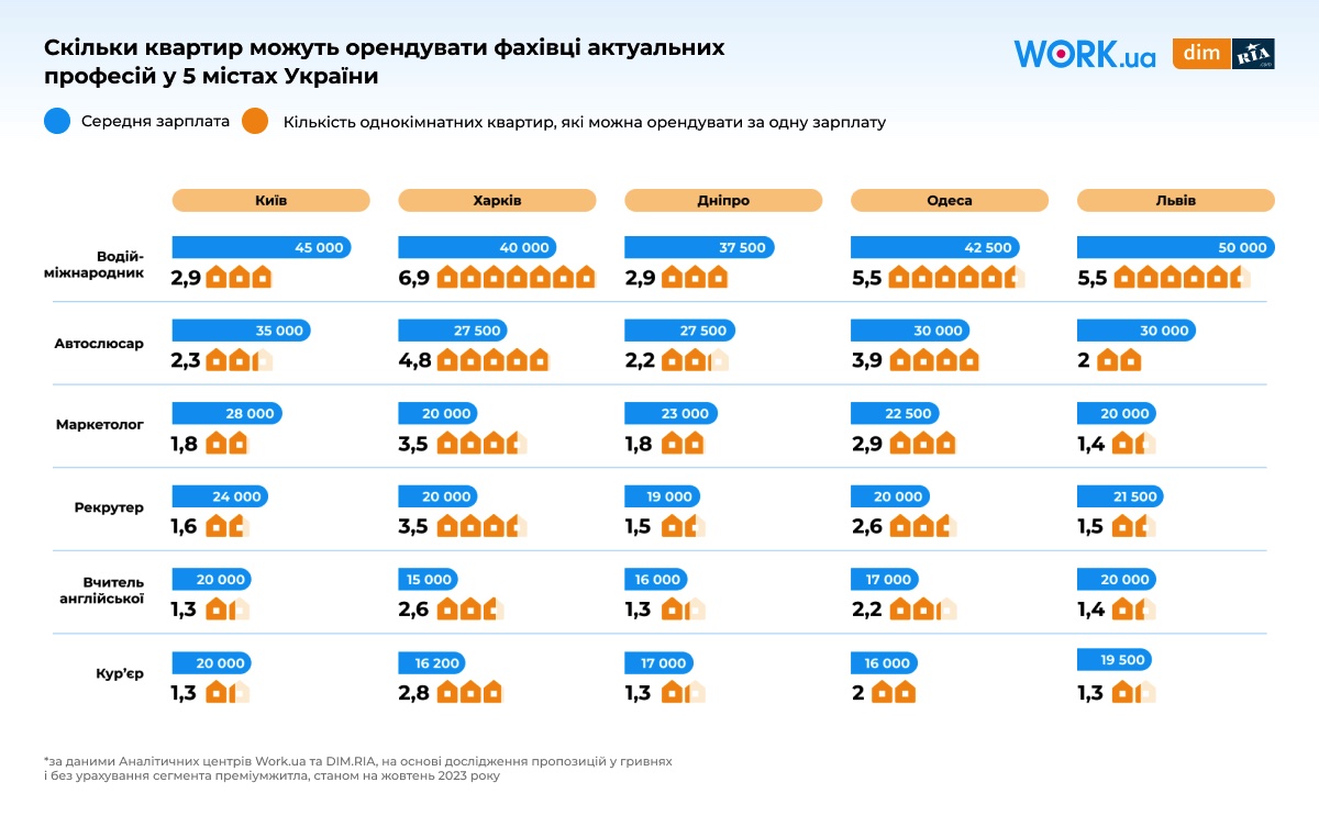 Аналітики також спробували порівняти різні міста за індексом «орендної спроможності». Наприклад, водій-міжнародник найбільше заробляє у Львові — 50 тисяч гривень. Однак його «орендна спроможність» така сама, як у колеги з Одеси, що заробляє 42,5 тисячі: обидва можуть винайняти по 5,5 квартир у своїх містах.