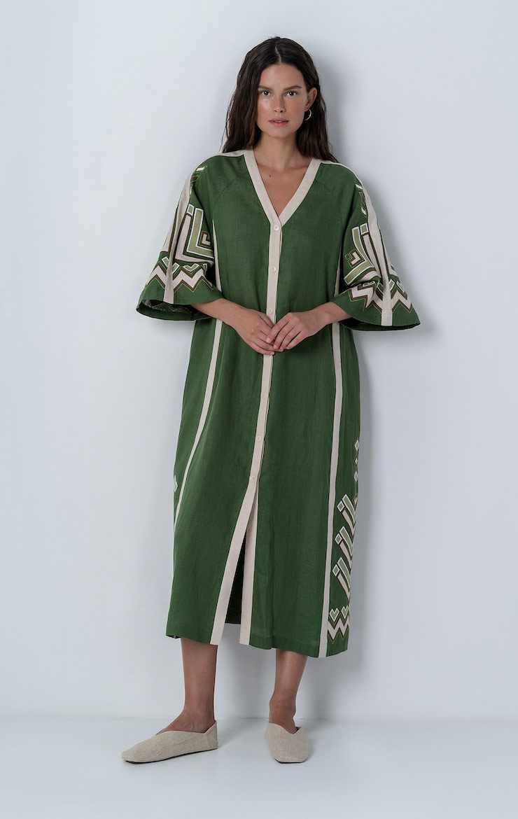 В Etnodim зазначають, що її часто можна побачити в речах від українських брендів. Цього разу її вибір пав на лляну зелену сукню Symwol від Etnodim, яка оздоблена вишивкою та контрастними декоративними вставками. Акторка поєднала сукню з білим гольфом та в’язаним комірцем зверху.