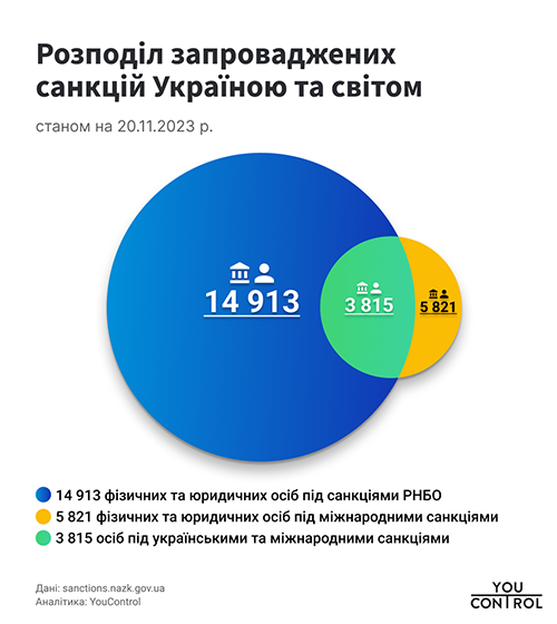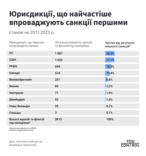 Якщо говорити про 3 815 осіб, на яких наклали санкції як РНБО, так і міжнародні інституції, то серед лідерів-ініціаторів їх запровадження були ЄС (1087), США (1033) та РНБО (699). Тобто Україна ініціювала першою санкції проти лише 18,3% підсанкційних осіб в межах «міжнародно-визнаної» групи.