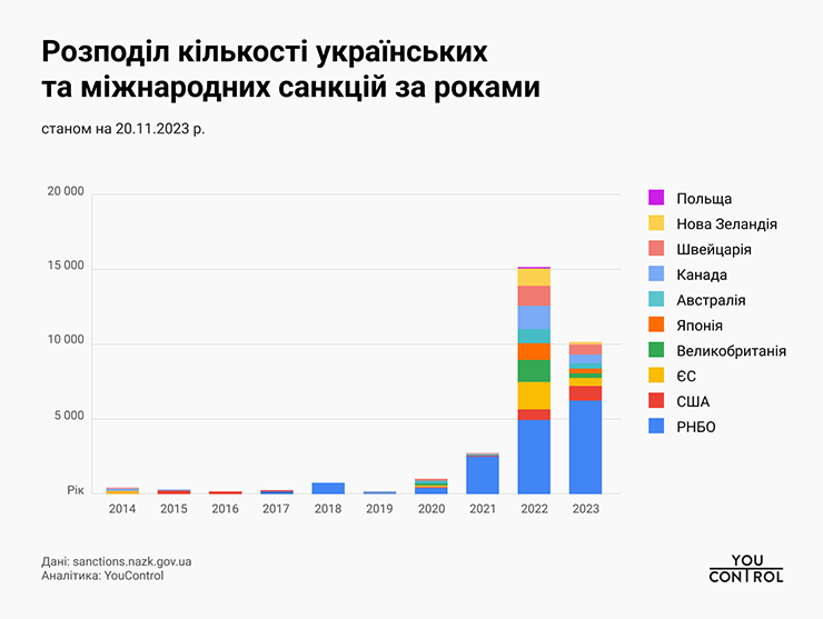 Аналітики також помітили, що пік санкцій США, ЄС, Великобританії та інших великих міжнародних гравців припав на 2022 рік – це понад 15 тис. санкцій, тоді як РНБО запровадила найбільше санкцій у 2023 році – 6,3 тисячі проти майже 5 тис. у 2022-му.