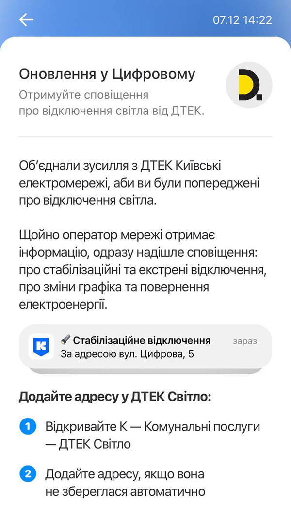 У планах «Київ Цифровий» та ДТЕК також повідомляти про планові роботи та аварії на електромережах.