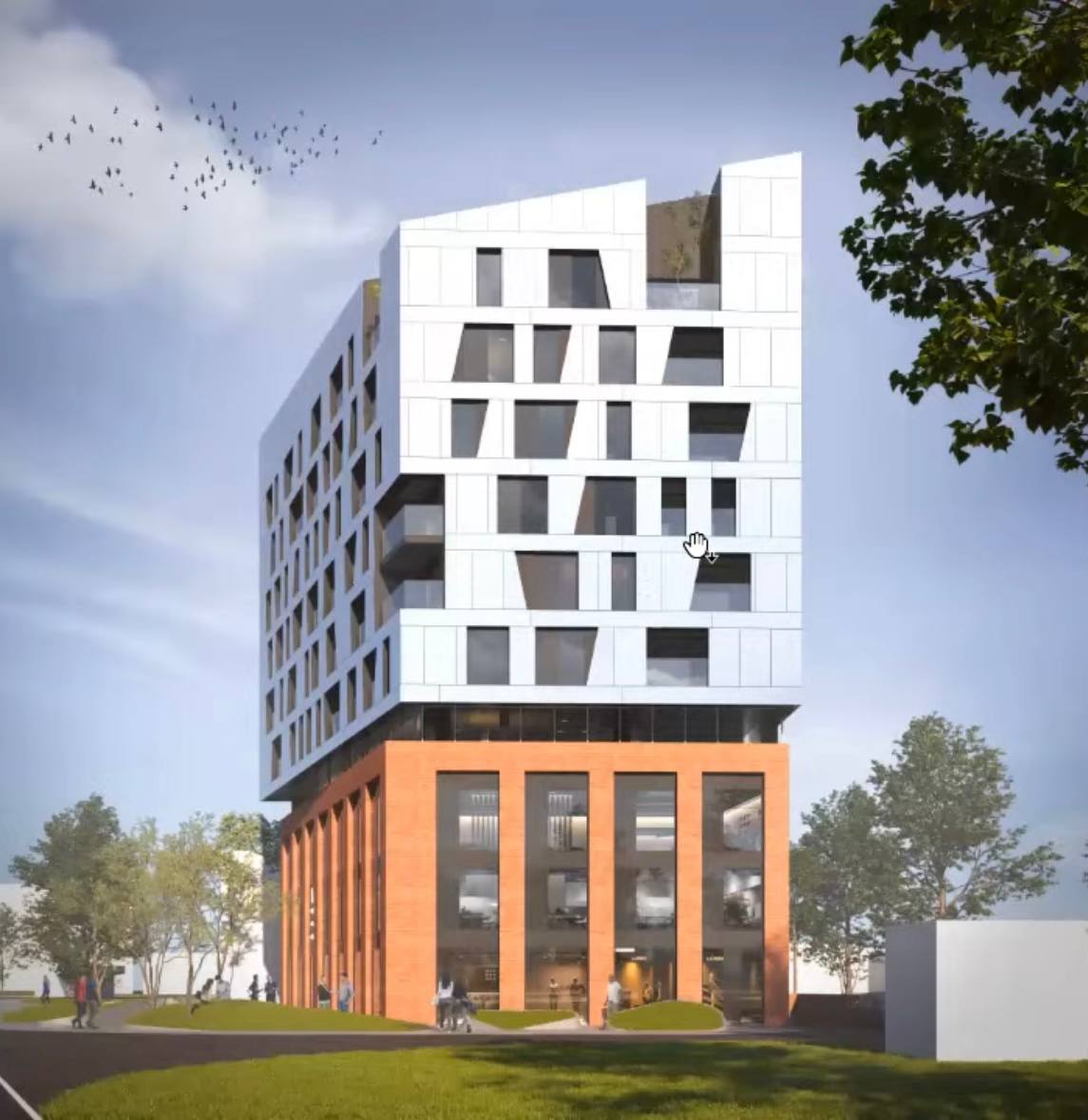 Основною функцією нової десятиповерхівки на вулиці Навроцького 1 буде апартготель. Також там розмістять офіси та магазини. Підземний паркінг буде розрахований на 40 автівок, нижній його рівень використовуватимуть як протирадіаційне укриття.