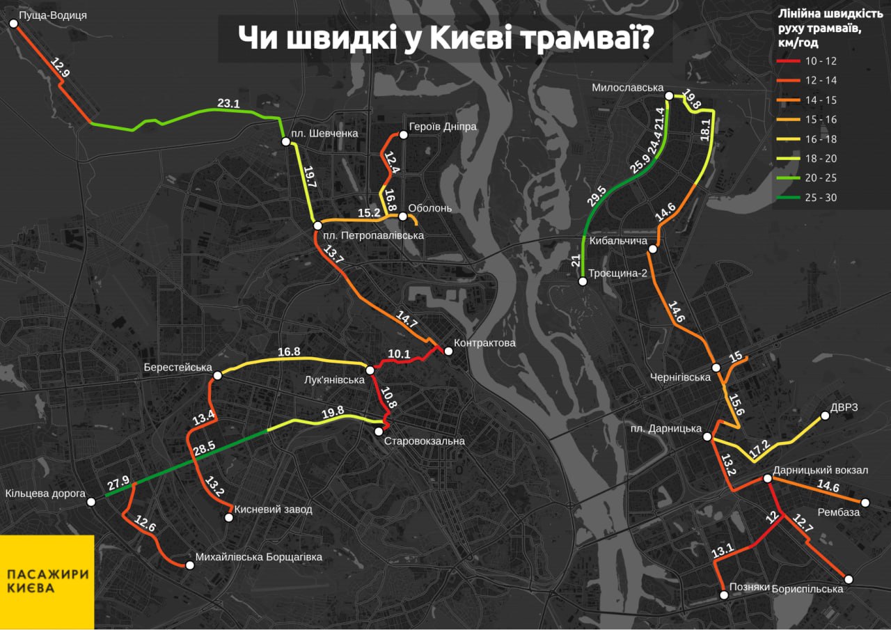 Громадська організація «Пасажири Києва» дослідила швидкість київських трамваїв – як виявилось, у багатьох місцях вона нижча за середню. Розрахунки проводили за допомогою графіків руху.