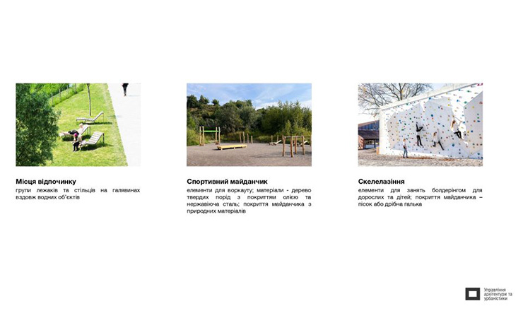 У міськраді планують облаштувати тут природний басейн, який будуть очищувати спеціальні рослини, створити прогулянкові алеї з дощовим садом та спортивними майданчиками, а також облаштувати «зелений екран» – нагадаємо, у Києві також хочуть створити «зелену» стіну. Планують створити й громадський простір: все буде виконано з екологічних матеріалів та із застосуванням дренажних поверхонь. Також буде встановлено дитячий майданчик та скеледром.