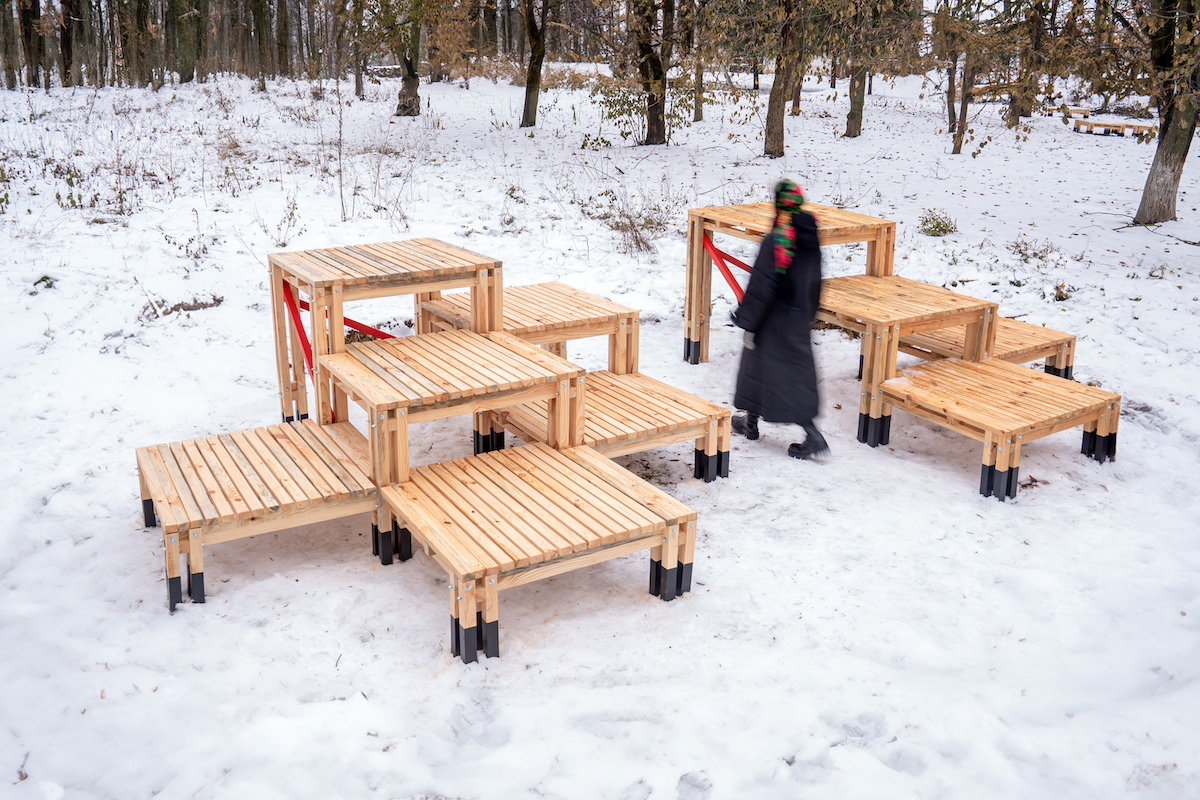 Проєкт конструкції амфітеатру розробили під час літньої практики Харківської школи архітектури «Просторова аптечка». Різні комбінації модулів створюють безліч сценаріїв: літературні читання, музичні вечори, чи можливість сісти перепочити серед дерев.