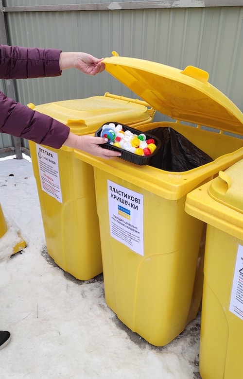 Тут збирають на переробку різноманітні види сміття, навіть чеки. Є, зокрема, мішок для відходів, які підуть на паливо: неліквідний пластик, ламінований картон, паперові стаканчики, контейнери для доставки їжі.