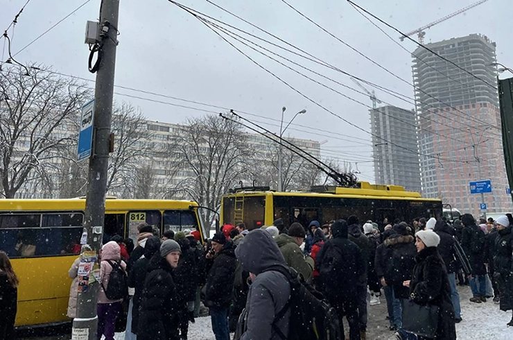 Під час тривоги традиційно зупинився увесь наземний комунальний транспорт, проте вчора почали зупиняти й маршрутки, каже депутатка Київради Ксенія Семенова. Наприклад, на вулиці Вадима Гетьмана, що поруч зі станцією метро «Шулявська», на смузі для громадського транспорту під час тривоги стояли понад 20 маршруток.